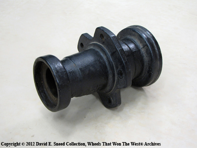 The photos shown in this blog feature a set of these skein adaptors that were originally purchased in the 1930s to be used on a high wheel wagon. These kits included five bolts that connected to the wheel rim while the sleeve, itself, slid over the wagon skein and was held on by the skein nut. The system was extremely efficient and allowed for quick modifications without permanently altering the original wheels belonging to the wagon. Simple, effective and modestly priced, these adaptors also allowed the wagon to be used as a trailer on improved roads. It was one more feature that extended the use of vintage wooden wagons well into 20th century America.