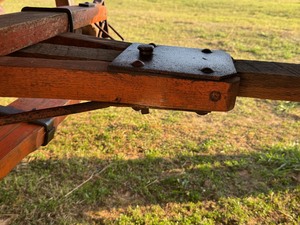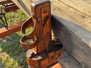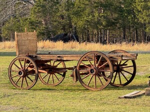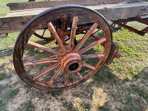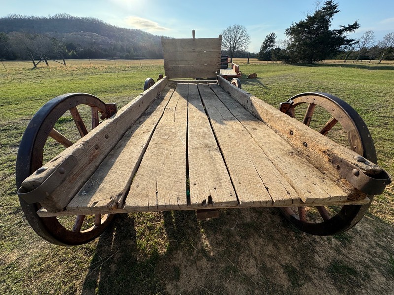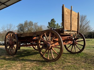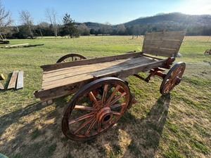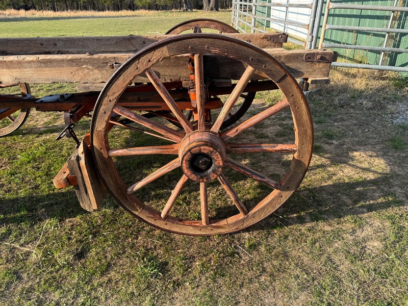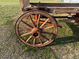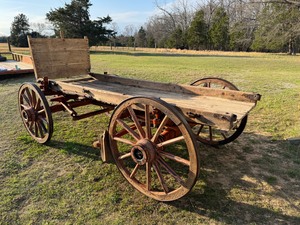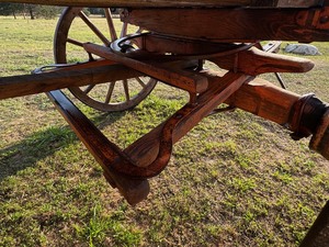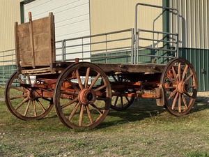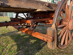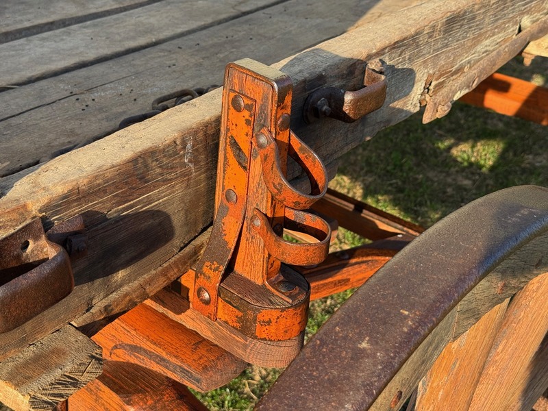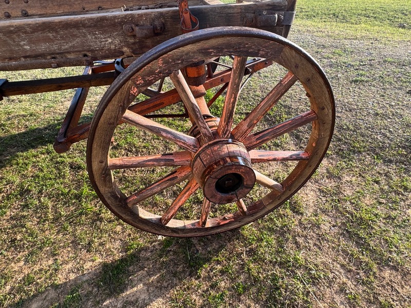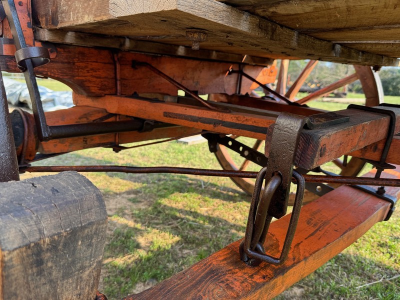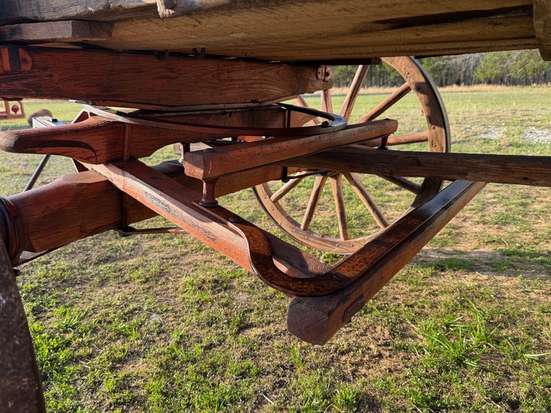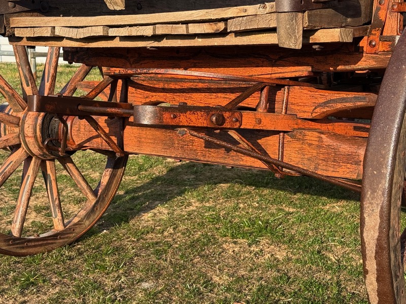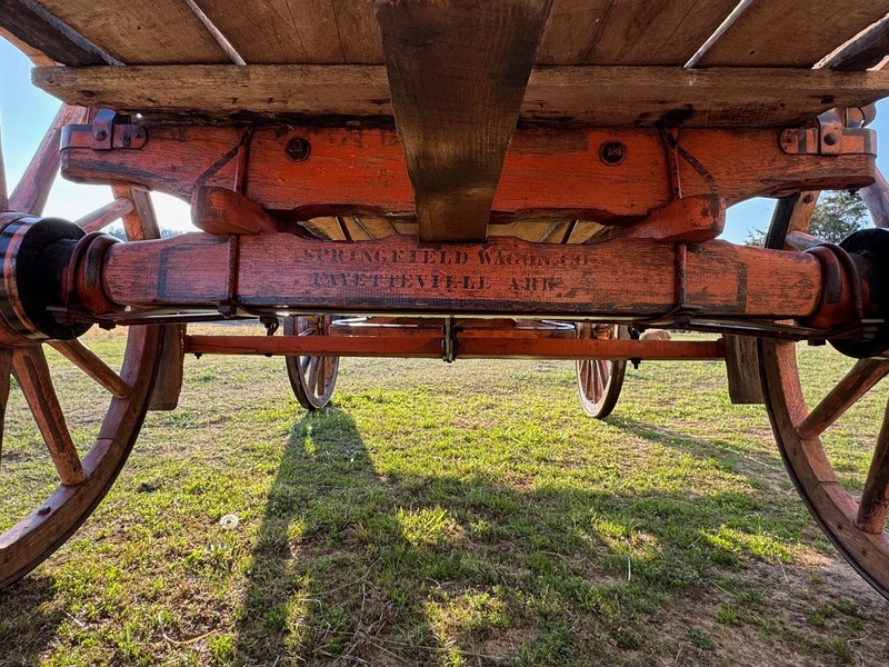 A 1940s Springfield brand running gear. This is a rare, barn-find survivor. Exceptional condition. The homemade cotton box has been heavily used and has a great look. The front panel easily slides in and out of position. This would make a great product centerpiece in a store or other type of display where products can be easily seen and accessed. The wider, 42-inch bolsters also work well for Sheep Camp wagons. More points of interest on this wood-wheeled antique include...