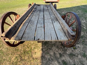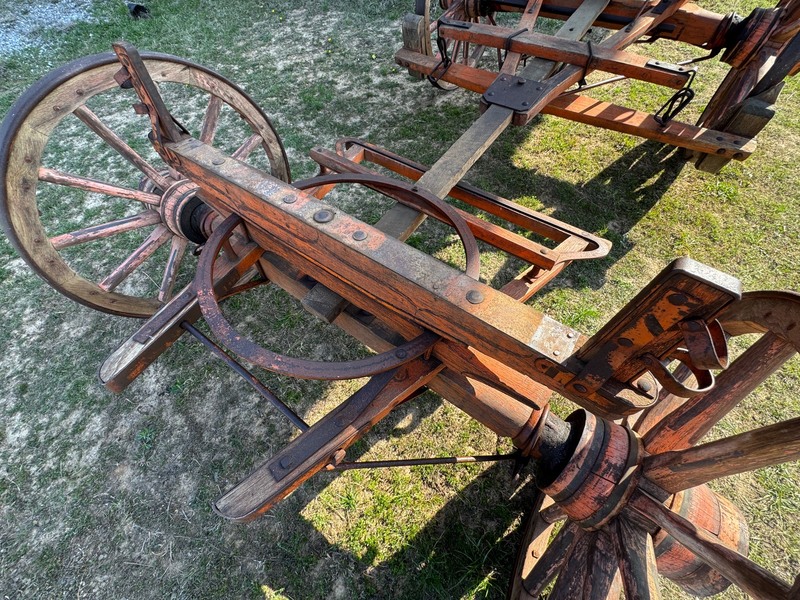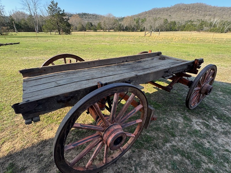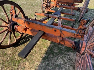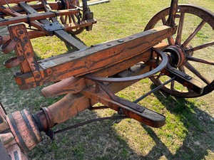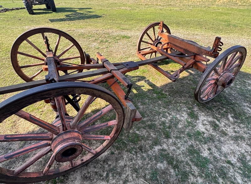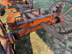 A 1940s Springfield brand running gear. This is a rare, barn-find survivor. Exceptional condition. The homemade cotton box has been heavily used and has a great look. The front panel easily slides in and out of position. This would make a great product centerpiece in a store or other type of display where products can be easily seen and accessed. The wider, 42-inch bolsters also work well for Sheep Camp wagons. More points of interest on this wood-wheeled antique include...